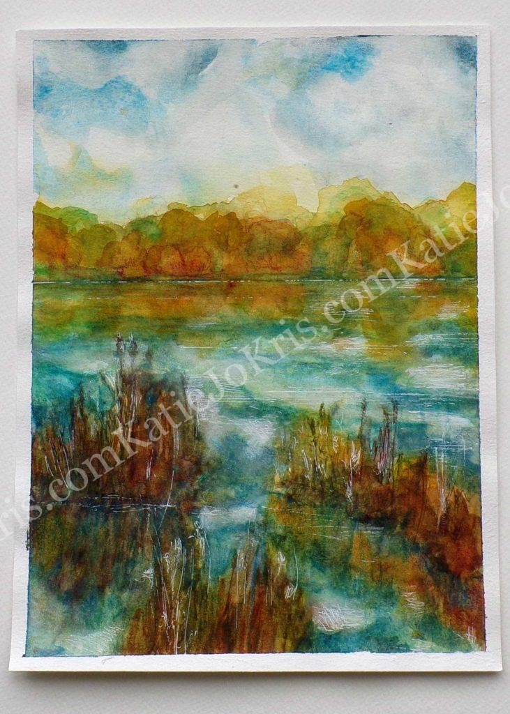Reeds and water. Fall landscape. Arty landscape. Loose watercolor.